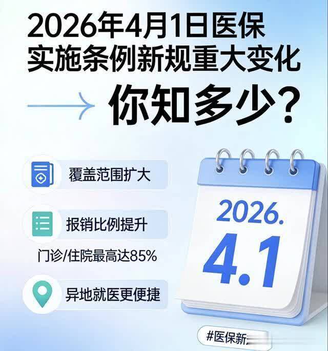 医保连着千万家,民生保障无小事。2026年4月1日即将执行的医保7号令,是国家聚焦民生痛点、优化医保服务、规范基金管理的重磅举措,坚守“待遇不降低、流程更简便、监管更严格”的核心原则,既给全体参保人带来实实在在的就医便利,又筑牢了医保基金的安全防线。